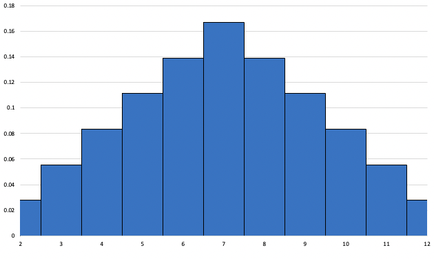 이산확률분포의 예시로 다시한번 주사위를 던질때의 상황을 가정해보겠습니다. 주사위를 두개 던졌을 때 각 주사위 숫자의 합과 그 합의 확률을 표로 정리하면 다음과 같습니다.